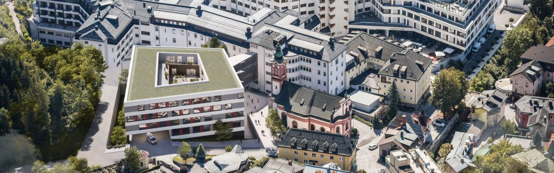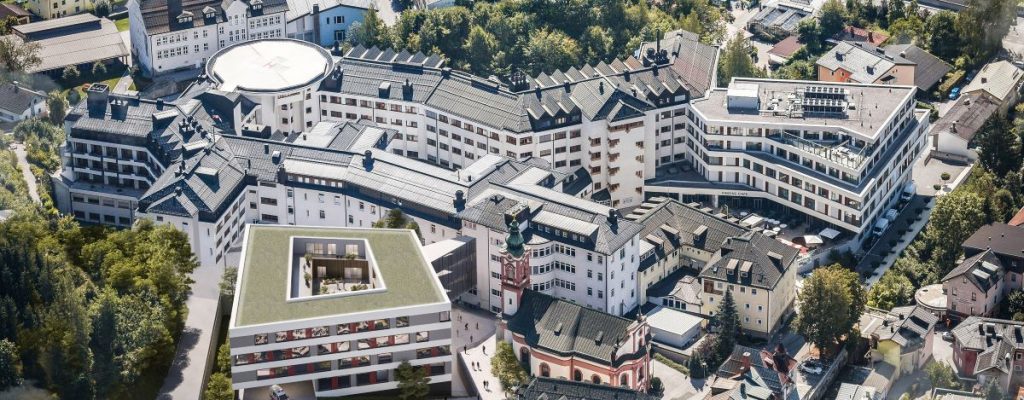 Der Zubau des Kardinal-Schwarzenberg-Klinikums (li. vorne) fügt sich harmonisch in die Umgebung ein.