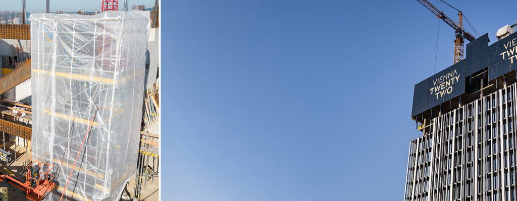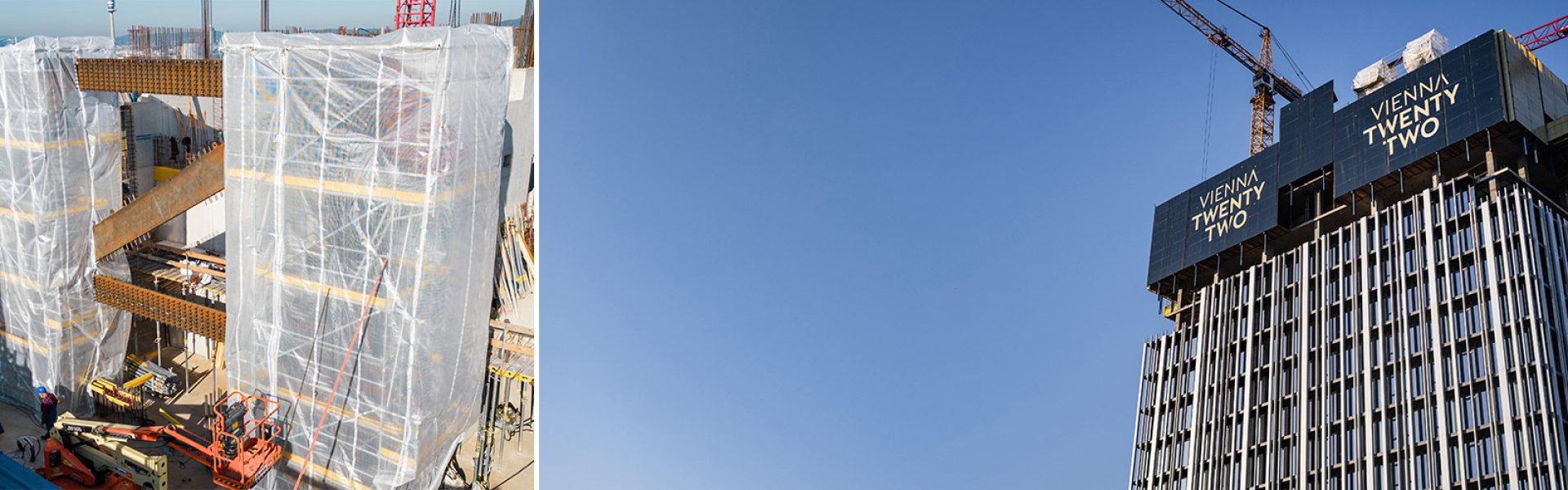 VIENNA TWENTYTWO – Ein begeisterndes Projekt, das die dynamische Aufbruchstimmung der Donaustadt verkörpert und von den bewährten Lösungen von Doka profitiert. Übrigens: Die Fertigstellung des mit 153m höchsten Bauteils ist bis Ende 2025 geplant.