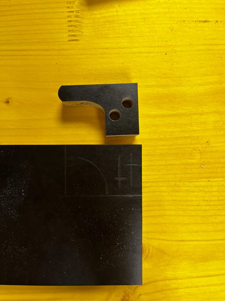 Für den Standfuß wird die Platte (400 x 100 mm) angezeichnet und ausgesägt, anschließend werden zwei Löcher gebohrt. Zum Fixieren des Standfußes benötigen wir die beiden letzten Platten (100 x 100 mm). Diese werden ebenfalls mit der Stichsäge ausgesägt und zwei Löcher gebohrt.